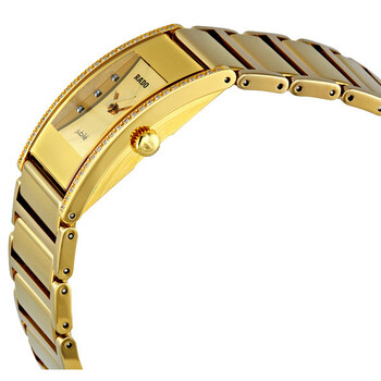 Gold-tone ceramic case with a gold-tone ceramic bracelet. Fixed gold-tone bezel set with 46 diamonds. Gold dial with gold-tone hands and 6 diamond hour markers. The Rado name appears at the 12 o'clock position. Dial Type: Analog. Quartz movement. Scratch resistant sapphire crystal. Solid case back. Case dimensions: 19.5 mm x 30.5 mm. Case thickness: 7 mm. Band width: 19 mm. Push button deployment clasp. Water resistant at 30 meters/ 100 feet. Functions: hours, minutes. Dress watch style.