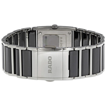 Stainless steel case with a stainless steel bracelet with black ceramic inserts. Fixed black ceramic bezel. Black (diamond-set) dial with silver-tone hands. The Rado name appears at the 12 o'clock position. Dial Type: Analog. Luminescent hands. Quartz movement. Scratch resistant sapphire crystal. Pull / push crown. Solid case back. Rectangle case shape. Case dimensions: 30.5 mm x 24 mm. Case thickness: 6.8 mm. Band width: 18 mm. Fold over clasp with a double push button release. Water resistant at 30 meters / 100 feet. Functions: hours, minutes. Dress watch style. Rado Integral Jubile Black Ceramic Ladies Watch R20786752.