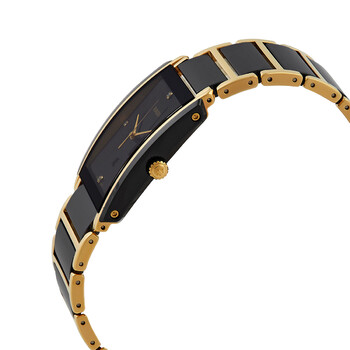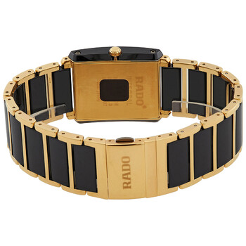 Gold-plated stainless steel case with a black and gold-plated stainless steel and ceramic bracelet. Fixed black ceramic with yellow gold-plated bezel. Black dial with gold-tone hands. Diamonds mark the 3, 6, 9 and 12 o'clock positions. Dial Type: Analog. Date display above the 6 o'clock position. ETA Caliber E61.111 quartz movement. Scratch resistant sapphire crystal. Pull / push crown. Solid case back. Rectangle case shape, case size: 31 mm. Band width: 20.3 mm, band length: 8 inches. Double fold over clasp. Water resistant at 50 meters / 165 feet. Functions: date, hour, minute, second. Integral Series. Dress watch style. Watch label: Swiss Made. Item Variations: 01.212.0204.3.071. Rado Integral Jubile Black Dial Men's Watch R20204712.