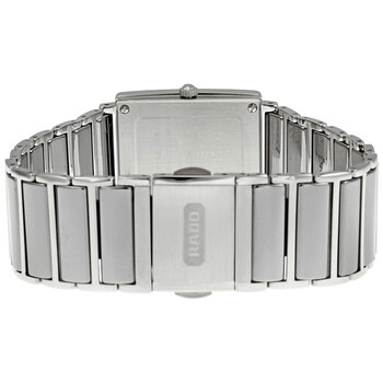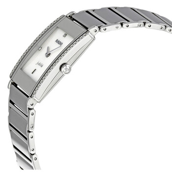 Platinum-tone ceramic case with a platinum-tone ceramic bracelet with steel trim. Platinum-tone ceramic bezel with steel trim and set with 40 diamonds. White mother of pearl dial with silver-tone hands and diamonds marking the 3, 6 and 9 o'clock positions. The Rado name appears at the 12 o'clock position hour markers. Quartz movement. Scratch resistant sapphire crystal. Dress crown. Solid case back. Case dimensions: 29 mm x 24 mm. Water resistant at 30 meters / 100 feet. Functions: hours, minutes. Rado Integral Jubile Large Ceramic Diamond Unisex Watch R20429909.