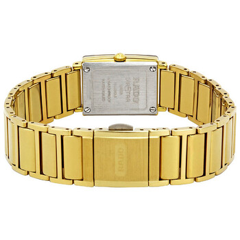 Gold-tone ceramic case with a gold-tone ceramic bracelet. Fixed bezel. Gold dial with gold-tone hands and stick hour markers. Quartz movement. Scratch resistant sapphire crystal. Solid case back. Case dimensions: 18 mm x 22 mm. Hidden push button deployment clasp. Water resistant at 30 meters / 100 feet. Functions: hours, minutes. Rado Integral Ladies Watch R20383272.