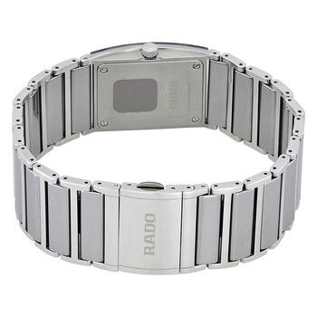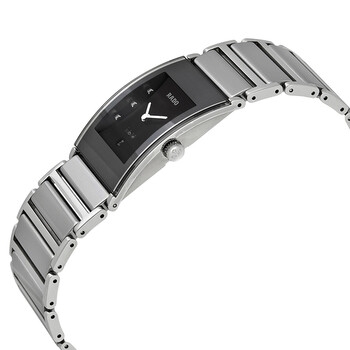 Ceramic case with a platinum-tone stainless steel link bracelet. Fixed bezel. Black with 6 round-cut diamonds (0.27 carats). Dial with silver-tone hands and diamond hour markers. Dial Type: analog. Date display appears at the 6 o'clock position. Quartz movement. Scratch resistant sapphire crystal. Case diameter: 24 mm. Water resistant at 30 meters / 100 feet. Functions: hours, minutes, date. Dress watch style. Rado Integral Midsize Diamond Watch R20785759.