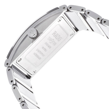 Silver-tone stainless steel case with a silver-tone stainless steel bracelet. Fixed silver-tone stainless steel bezel. Black dial with silver-tone hands and index hour markers. Dial Type: Analog. Quartz movement. Pull / push crown. Solid case back. Rectangle case shape. Case size: 30 mm x 19 mm. Butterfly clasp. Water resistant at 30 meters / 100 feet. Functions: hour, minute. Casual watch style. Watch label: Swiss Made. Rado Integral Quartz Black Dial Ladies Watch R20786159.