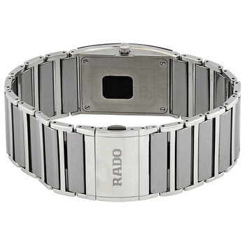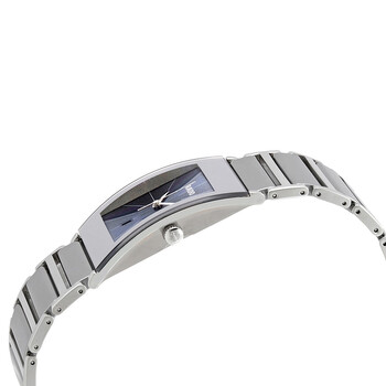 Stainless steel case with a stainless steel bracelet with ceramos inserts. Fixedstainless steel bezel. Blue dial with silver-tone hands and index hour markers. Dial Type: Analog. Date display at the 6 o'clock position. Rado calibre 152 quartz movement. Scratch resistant sapphire crystal. Pull / push crown. Solid case back. Square case shape. Case dimensions: 40 mm x 27mm. Case thickness: 8 mm. Band width: 27 mm. Band length: 7.5 inches. Titanium double fold over clasp. Water resistant at 30 meters / 100 feet. Functions: date, hour, minute, second. Casual watch style. Watch label: Swiss Made. Rado Integral Quartz Blue Dial Men's Watch R20745202.
