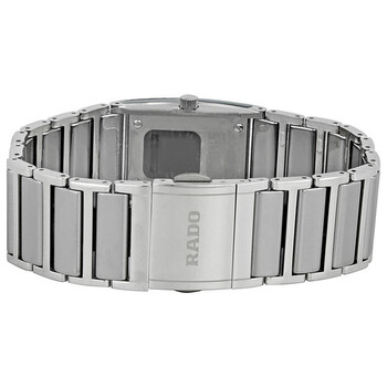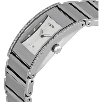 Ceramic case with a ceramic bracelet. Fixed bezel set with 46 diamonds (0.13 carats). Silver dial with silver-tone hands and 6 diamond hour markers. Quartz movement. Scratch resistant sapphire crystal. Solid case back. Case dimensions: 20 mm x 27mm. Deployment clasp. Water resistant at 30 meters/ 100 feet. Functions: hours, minute. Rado Integral Silver Dial Diamond Ladies Watch R20733712.