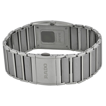 Platinum-tone ceramic case with a platinum-tone ceramic bracelet. Fixed bezel. Silver dial set with six diamonds with luminous hands. Dial Type: Analog. Date display appears at the 6 o'clock position. Quartz movement. Scratch resistant sapphire crystal. Pull / push crown. Solid case back. Case dimensionsr: 28 mm x 31 mm. Case thickness: 11 mm. Rectangle case shape. Band width: 28 mm. Band length: 7.5 inches. Push button deployment clasp. Water resistant at 30 meters/ 100 feet. Functions: hours, minutes, date. Dress watch style. Rado Integral Silver Dial Diamond Platium Tone Ceramic Ladies Watch R20732712.