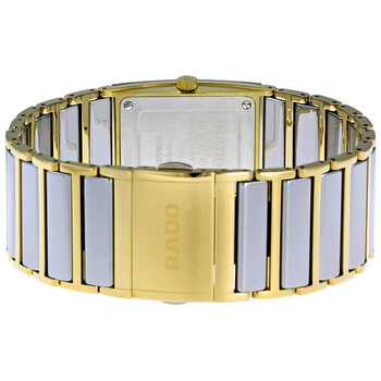 Gold-tone ceramic case with gold trim case with a two-tone (platinum-tone and gold-tone) ceramic bracelet with gold trim bracelet. Fixed two-tone (platinum-tone and gold-tone) ceramic bezel. Silver dial with gold-tone hands and diamond hour markers. The rado name appears below the 12 o'clock position. Dial Type: Analog. Date display at the 6 o'clock position. Quartz movement. Scratch resistant sapphire crystal. Pull / push crown. Solid case back. Rectangle case shape, case size: 30 mm x 23 mm, case thickness: 11 mm. Band width: 23 mm. Deployment with push button release clasp. Water resistant at 30 meters / 100 feet. Functions: date, hour, minute. Dress watch style. Watch label: Swiss. Rado Integral Silver Dial Two Tone Ceramic Unisex Watch R20749702.