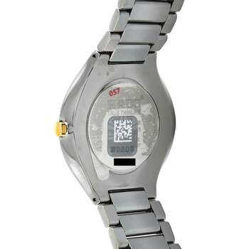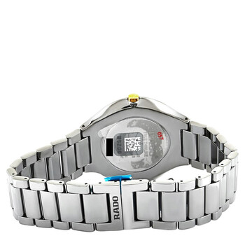 Silver-tone ceramic case and bracelet. Fixed silver-tone ceramic bezel. Silver-tone dial with yellow gold-tone hands and index hour markers. Minute markers around the outer rim. Dial Type: Analog. Luminescent hands. Quartz movement. Solid case back. Round case shape, case size: 39 mm. Deployment with push button release clasp. Water resistant at 30 meters / 100 feet. Functions: hour, minute. Montres Series. Luxury watch style. Watch label: Swiss Made. Rado Montres Quartz Silver Dial Men's Watch R27955112/01.140.0955.3.011.