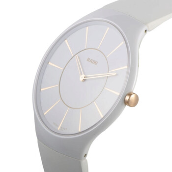 White ceramic case with a white rubber strap. Fixed white ceramic bezel. White dial with gold-tone skeleton hands and index hour markers. Dial Type: Analog. Quartz movement. Scratch resistant sapphire crystal. Pull / push crown. Solid case back. Round case shape. Case size: 39 mm. Tang clasp. Water resistant at 50 meters / 165 feet. Functions: hour, minute. Montres Series. Luxury watch style. Rado Montres Quartz White Dial Ladies Watch R27957109/01.140.0957.3.110.