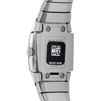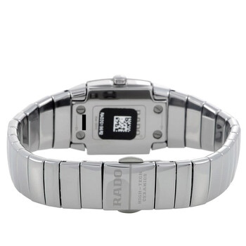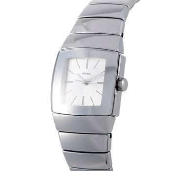 Silver-tone ceramic case and bracelet. Fixed silver-tone ceramic bezel. White dial with silver-tone hands and index hour markers. Dial Type: Analog. Quartz movement. Scratch resistant sapphire crystal. Pull / push crown. Solid case back. Square case shape. Case size: 22 mm. Fold over clasp with a push button release. Water resistant at 30 meters / 100 feet. Functions: hour, minute, second. Montres Sintra Series. Luxury watch style. Rado Montres Sintra Quartz White Dial Ladies Watch R13722122/01.318.0722.3.012.