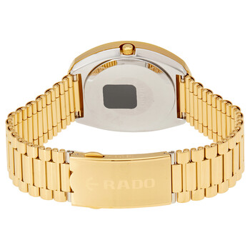 Yellow gold CVD stainless steel case and bracelet. Fixed yellow gold CVD bezel. Black dial with yellow gold-tone hands and diamond hour markers. Minute markers around the outer rim. Dial Type: Analog. Day of the week and date display above the 6 o'clock position. Quartz movement. Scratch resistant sapphire crystal. Pull / push crown. Solid case back. Round case shape. Case size: 35 mm. Case thickness: 10.1 mm. Band width: 18 mm. Hidden fold over clasp. Water resistant at 30 meters / 100 feet. Functions: date, day, hour, minute, second. Dress watch style. Watch label: Swiss Made. Rado Original Black Dial Men's Watch R12304313.