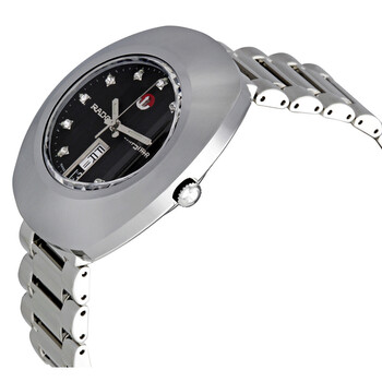 Stainless steel case with a stainless steel bracelet. Fixed stainless steel bezel. Black dial with luminous silver-tone hands and diamond hour markers. Minute markers around the outer rim. Dial Type: Analog. Luminescent hands. Day of the week and date display at the 6 o'clock position. Automatic movement with a 38-hour power reserve. Scratch resistant sapphire crystal. Pull / push crown. Solid case back. Case dimensions: 43 mm x 35 mm. Round case shape. Band width: 20 mm. Band length: 8 inches. Deployment clasp. Water resistant at 30 meters/ 100 feet. Functions: date, day, hour, minute, second. Dress watch style. Watch label: Swiss Made. Item Variations: 648.0408.3.161. Rado Original Diastar Black Dial Diamond Stainless Steel Men's Watch R12408614.