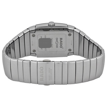 Platinum-tone ceramic case with a platinum-tone ceramic bracelet. Fixed platinum-tone ceramic bezel. Silver grid dial with silver-tone hands. No markers. the rado name appears at the 12 o'clock position. Dial Type: Analog. Date display at the 6 o'clock position. Quartz movement. Scratch resistant sapphire crystal. Pull / push crown. Solid case back. Case dimensions: 22.1 mm x 29.9 mm. Case thickness: 7.9 mm. Rectangle case shape. Band width: 29.9 mm. Band length: 7.5 inches. Hidden push button clasp. Water resistant at 30 meters / 100 feet. Functions: hours, minutes, seconds, date. Casual watch style. Rado Sintra Ceramic Watch R13720112.