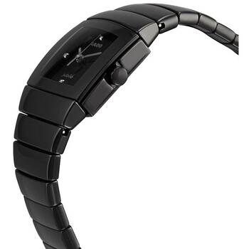 Black ceramic case with a black ceramic bracelet. Fixed black ceramic bezel. Black dial with silve-tone hands and diamond markers at the quarter hour positions. Quartz movement. Scratch resistant sapphire crystal. Solid case back. Case dimensions: 30 mm x 22 mm. Case thickness: 8 mm. Deployment clasp. Water resistant at 30 meter/ 100 feet. Functions: hours, minutes, seconds. Rado Sintra Ladies Watch R13726702.