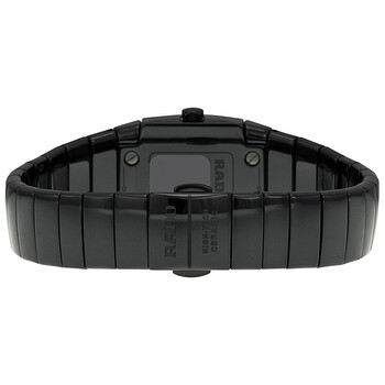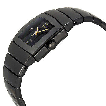 Black ceramic case with a black ceramic bracelet. Fixed black ceramic bezel. Black dial with gold-tone hands and diamond markers at the quater hour positions. Quartz movement. Scratch resistant sapphire crystal. Solid case back. Case dimensions: 29 mm x 22 mm. Case thickness: 8 mm. Push button folding clasp. Water resistant at 30 meters/ 100 feet. Functions: hours, minutes, seconds. Rado Sintra Ladies Watch R13726712.