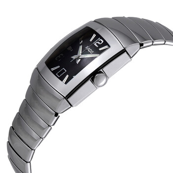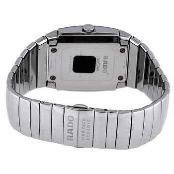 Platinum-tone ceramic case and bracelet. Fixed platinum-tone ceramic bezel. Black dial with luminous silver-tone hands and index hour markers. Arabic numerals mark the 4, 8 and 12 o'clock positions. Dial Type: Analog. Quartz movement. Scratch resistant sapphire crystal. Pull / push crown. Solid case back. Rectangle case shape. Case dimensions: 35 mm x 33 mm. Case thickness: 11 mm. Hidden push button deployment clasp. Water resistant at 30 meters / 100 feet. Functions: date, hour, minute, second. Additional Info: date displays at 6 o'clock position. Sintra Series. Casual watch style. Rado Sintra Platinum-tone Ceramic Black Men's Watch R13599152.