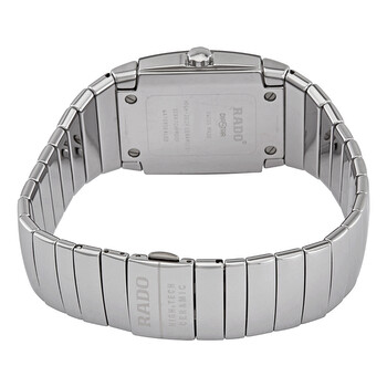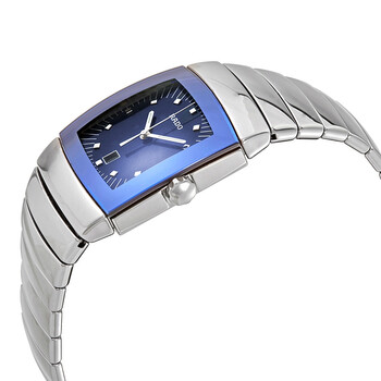 Silver-tone ceramic case with a silver-tone ceramic bracelet. Fixed blue ceramic bezel. Blue dial with silver-tone hands and index hour markers. Minute markers around the outer rim. Dial Type: Analog. Luminescent hands. Date display at the 6 o'clock position. Rado Calibre 129 quartz movement. Scratch resistant sapphire crystal. Pull / push crown. Solid case back. Round case shape, case size: 32 mm x 41 mm, case thickness: 9 mm. Band width: 26 mm, band length: 8 inches. Fold over with safety release clasp. Water resistant at 30 meters / 100 feet. Functions: date, hour, minute, second. Casual watch style. Watch label: Swiss Made. Rado Sintra Quartz Blue Dial Men's Watch R13810202.