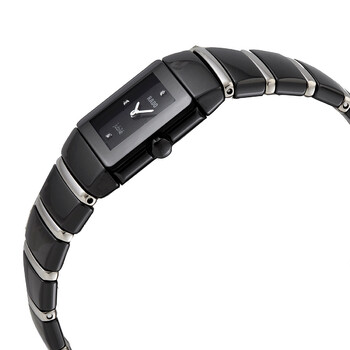 Black ceramic case with a black ceramic bracelet with 18kt white gold bars. Fixed black ceramic bezel. Black dial with silver-tone hands. Diamonds set at the 3, 6, 9 and 12 o'clock positions. Dial Type: Analog. Quartz movement. Scratch resistant sapphire crystal. Pull / push crown. Solid case back. Square case shape. Case dimensions: 21 mm x 18 mm. Hidden fold over clasp. Water resistant at 30 meters / 100 feet. Functions: hour, minute, second. Sintra Series. Dress watch style. Item Variations: DO R13337732, DO.R13337732, DOR13337732. Rado Sintra Quartz Diamond Ladies Watch DO-R13337732.