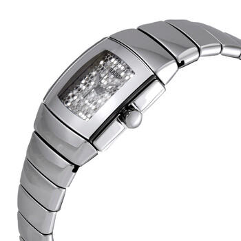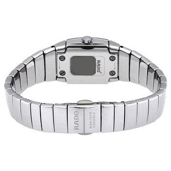 Silver-tone ceramos case with a silver-tone ceramos band. Fixed silver-tone ceramos bezel. Silver dial with silver-tone hands. No markers. Dial Type: Analog. Quartz movement. Scratch resistant sapphire crystal. Pull / push crown. Solid case back. Cushion case shape. Case size: 22 mm. Case thickness: 8 mm. Band width: 18 mm, band length: 6.5 inches. Titanium double fold over clasp with a push button release. Water resistant at 30 meters / 100 feet. Functions: hour, minute, second. Additional Info: Ceramos is a hi-tech ceramic and metal composite). Sintra Series. Casual watch style. Watch label: Swiss Movt. Rado Sintra Quartz Silver Dial Ladies Watch R13722112.