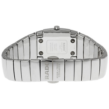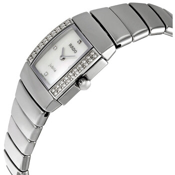 Platinum-tone ceramic case with a platinum-tone ceramic bracelet. Fixed platinum-tone 40 diamond set bezel. White mother-of-pearl dial with silver-tone hands and diamond hour markers. Dial Type: Analog. Rado Calibre 153 quartz movement. Scratch resistant sapphire crystal. Pull / push crown. Solid case back. Tonneau case shape, case size: 29 mm x 25 mm, case thickness: 7 mm. Band width: 18 mm. Titanium hidden push button deployment clasp. Water resistant at 30 meters / 100 feet. Functions: hour, minute. Additional Info: date displays at 6 o'clock position. Dress watch style. Watch label: Swiss. Item Variations: R13578902, Rado-R13578902, 13578902. Rado Sintra Superjubile Diamond White Mother-of-Pearl Ladies Watch R13578902.