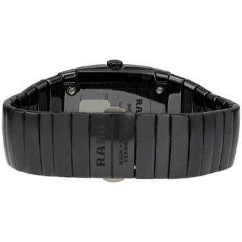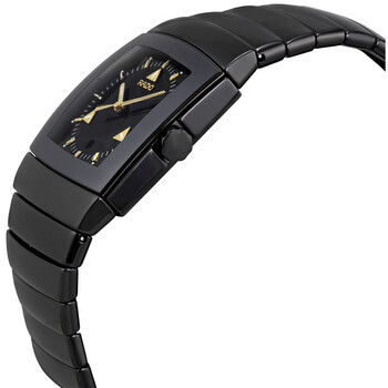 Black ceramic case with a black ceramic link bracelet. Fixed blck ceramic bezel. Black dial with gold-tone hands and index hour markers. Minute markers around the outer rim. Dial Type: analog. Date display appears at the 6 o'clock position. Quartz movement. Scratch resistant sapphire crystal. Case dimensions: 32 mm x 41 mm. Case thickness: 10 mm. Band width: 20 mm. Push button deployment clasp. Water resistant at 30 meters/ 100 feet. Functions: hours, minutes, seconds, date. Dress watch style. Rado Sintra XL Black Dial Black Ceramic Men's Watch R13724172.