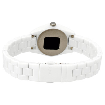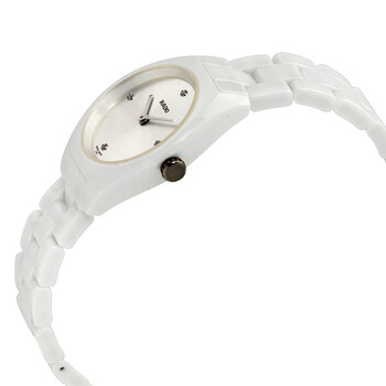 White ceramos case with a white ceramos bracelet. Fixed white ceramos bezel. Silver dial with silver-tone hands. Diamonds mark the 3, 6, 9 and 12 o'clock positions. Dial Type: Analog. Quartz movement. Scratch resistant sapphire crystal. Pull / push crown. Solid case back. Round case shape, case size: 31 mm x 25 mm, case thickness: 7 mm. Band width: 12 mm, band length: 6.5 inches. Fold over with push button release clasp. Water resistant at 30 meters / 100 feet. Functions: hour, minute. Dress watch style. Watch label: Swiss Made. Rado Specchio Diamond Silver Dial Ladies Watch R31509702.