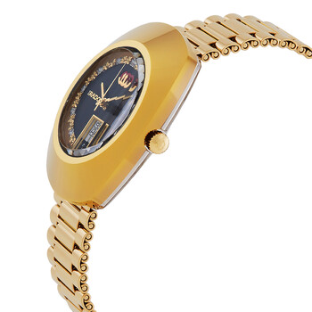 Yellow gold PVD stainless steel case and bracelet. Fixed yellow gold PVD stainless steel bezel. Black dial with gold-tone hands and diamond hour markers. Dial Type: Analog. Luminescent hands. Day of the week and date display at the 6 o'clock position. Automatic movement. Scratch resistant sapphire crystal. Pull / push crown. Solid case back. Oval case shape, case size: 35 mm, case thickness: 11.9 mm. Band width: 17.9 mm. Fold over clasp with a safety release. Water resistant at 30 meters / 100 feet. Functions: date, day, hour, minute, second. The Original Series. Dress watch style. Watch label: Swiss Made. Item Variations: 01.764.0413.3.058. Rado The Original Automatic Diamond Black Dial Men's Watch R12413583.
