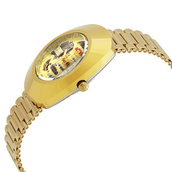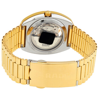 Yellow gold-tone stainless steel case and bracelet. Fixed yellow gold-tone stainless steel bezel. Gold-tone dial with yellow gold-tone hands and index hour markers. Minute markers around the outer rim. Dial Type: Analog. Luminescent hands. Automatic movement. Scratch resistant sapphire crystal. Transparent see through case back. Oval case shape, case size: 35 mm. Fold over clasp. Water resistant at 30 meters / 100 feet. Functions: hour, minute, second. The Original Series. Casual watch style. Watch label: Swiss Made. Rado The original Automatic Gold Dial Men's Watch R12064253.