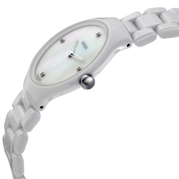 White ceramic case with a white ceramic bracelet. Fixed white ceramic bezel. White mother of pearl dial with silver-tone hands. Diamonds mark the 3, 6, 9 and 12 o'clock positions. Dial Type: Analog. Quartz movement. Scratch resistant sapphire crystal. Pull / push crown. Solid case back. Round case shape. Case size: 30 mm. Case thickness: 5 mm. Band width: 15 mm. Band length: 7 inches. Fold over clasp with a push button release. Water resistant at 30 meters / 100 feet. Functions: hour, minute. True Series. Dress watch style. Watch label: Swiss Made. Rado Thinline Mother of Pearl Dial White Ceramic Watch R27958902.