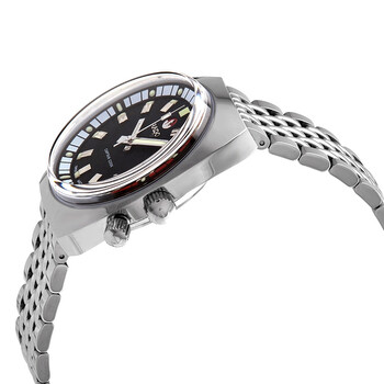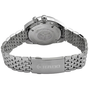 Silver-tone stainless steel case and bracelet. Fixed silver-tone stainless steel bezel. Black dial with luminous silver-tone hands and dot hour markers. Dial Type: Analog. Luminescent hands and markers. Date display at the 3 o'clock position. ETA Caliber C07.611 Automatic movement, containing 25 Jewels, bitting at 21600 vph, and has a power reserve of approximately 80 hours. Scratch resistant sapphire crystal. Screw down crown. Solid case back. Round case shape, case size: 37 mm, case thickness: 14.3 mm. Deployment with push button release clasp. Water resistant at 220 meters / 720 feet. Functions: date, hour, minute, second. Tradition Captain Cook Mkii Series. Dive watch style. Watch label: Swiss Made. Rado Tradition Captain Cook MKII Automatic Black Dial Men's Watch R33522153.