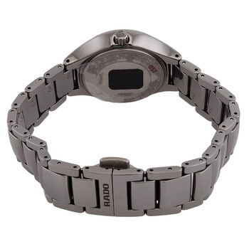Black plasma high-tech ceramic case with a black plasma high-tech ceramic, titanium bracelet. Fixed black plasma high-tech ceramic bezel. Grey dial with rose gold-tone hands and diamond hour markers. Dial Type: Analog. Luminescent hands. Date display at the 3 o'clock position. Automatic movement with a 38 hr power reserve. Scratch resistant sapphire crystal. Solid case back. Round case shape, case size: 30 mm, case thickness: 9.8 mm. Folding clasp. Water resistant at 50 meters / 165 feet. Functions: date, hour, minute, second. True Series. Dress watch style. Watch label: Swiss Made. Item Variations: 01.561.0243.3.071. Rado True Automatic Diamond Grey Dial Ladies Watch R27243712.