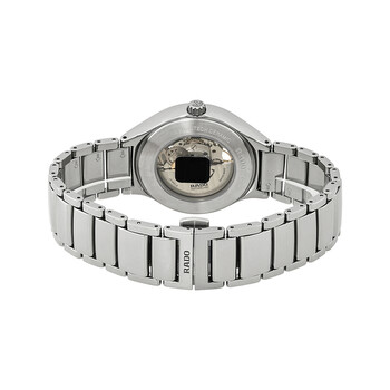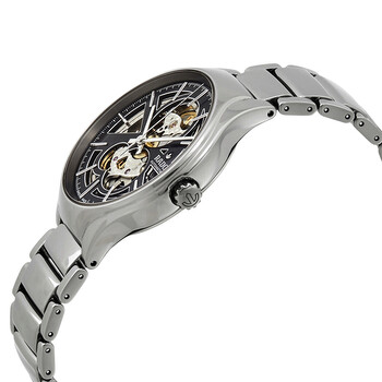 Gunmetal plasma high-tech ceramic case and bracelet. Fixed gunmetal high-tech ceramic bezel. Black / skeleton dial with luminous silver-tone hands and index hour markers. Minute markers around the outer rim. Dial Type: Analog. Luminescent hands and markers. Automatic movement. Scratch resistant sapphire crystal. Transparent case back. Round case shape. Case size: 40 mm. Case thickness: 10.4 mm. Band width: 20 mm. Butterfly clasp. Water resistant at 50 meters / 165 feet. Functions: hour, minute, second. Casual watch style. Watch label: Swiss Made. Rado True Automatic Open Heart Black/Skeleton Dial Men's Watch R27510152.