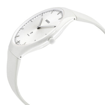 White ceramic case with a white rubber strap. Fixed white ceramic bezel. White dial with silver-tone hands and index hour markers. Minute markers around the outer rim. Dial Type: Analog. Rado calibre 629 (ETA 2892-A2) automatic movement, based upon ETA 2892-A2, containing 21 Jewels, bitting at 28800 vph, and has a power reserve of approximately 42 hours. Scratch resistant sapphire crystal. Pull / push crown. Solid case back. Round case shape. Case dimensions: 40 mm x 35 mm. Case thickness: 8 mm. Band width: 16 mm. Fold over clasp. Water resistant at 30 meters / 100 feet. Functions: hours and minutes. True Series. Sport watch style. Watch label: Swiss Made. Rado True Automatic White Ceramic Ladies Watch R27970109.