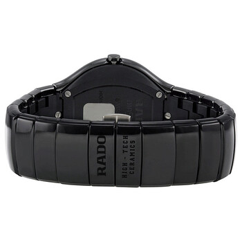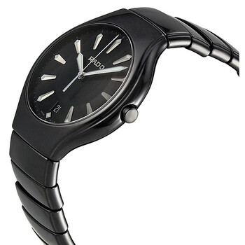 Polished black ceramic case with a black ceramic bracelet. Fixed black ceramic bezel. Black dial with silver-tone hands and index hour markers. Minute markers around the outer rim. Dial Type: Analog. Luminescent hands. Date display at the 6 o'clock position. Quartz movement. Scratch resistant sapphire crystal. Pull / push crown. Solid case back. Case diameter: 40 mm. Round case shape. Tang clasp. Water resistant at 30 meters / 100 feet. Functions: date, hour, minute, second. Casual watch style. Watch label: Swiss Made. Rado True Black Ceramic Men's Watch R27653152.