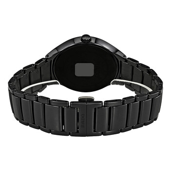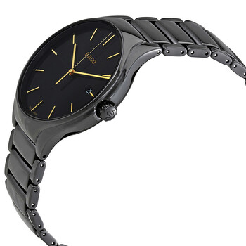 Black (high-tech) ceramic case and bracelet. Fixed black (high-tech) ceramic bezel. Black dial with gold-tone hands and index hour markers. Dial Type: Analog. Date display at the 3 o'clock position. Rado calibre 115 quartz movement. Scratch resistant sapphire crystal. Pull / push crown. Solid case back. Round case shape. Case size: 40 mm. Case thickness: 8.9 mm. Band width: 20 mm. Deployment clasp. Water resistant at 50 meters / 165 feet. Functions: date, hour, minute, second. Dress watch style. Watch label: Swiss Made. Rado True Black Dial Ceramic Men's Watch R27238152.