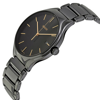 Black (high-tech) ceramic case with a black (high-tech) ceramic bracelet. Fixed black (high-tech) ceramic bezel. Black dial with rose gold-tone hands and index hour markers. Dial Type: Analog. Date display at the 3 o'clock position. Rado Calibre 115 quartz movement. Scratch resistant sapphire crystal. Pull / push crown. Solid case back. Round case shape. Case size: 40 mm. Case thickness: 8.9 mm. Band width: 20 mm. Deployment clasp. Water resistant at 50 meters / 165 feet. Functions: date, hour, minute, second. True Series. Dress watch style. Watch label: Swiss Made. Rado True Black Dial Ceramic Men's Watch R27238162.