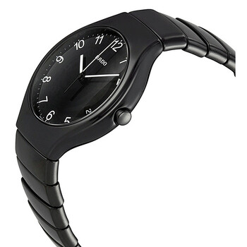 Ceramic case with a ceramic bracelet. Uni-directional rotating bezel. Black dial with black hands and Arabic numeral hour markers. Minute markers around the outer rim. Dial Type: Analog. Luminescent hands and markers. Date display at the 4 o'clock position. Quartz movement. Scratch resistant sapphire crystal. Solid case back. Case diameter: 39 mm. Round case shape. Deployment with push button clasp. Water resistant at 30 meters / 100 feet. Functions: date, hour, minute, second. Watch label: Swiss Made. Rado True Black Dial Ceramic Men's Watch R27653192.