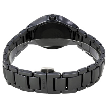 Black high-tech ceramic case with a black high-tech ceramic bracelet. Fixed black ceramic bezel. Black dial with luminous gold-tone hands. Diamonds mark the 3, 6, 9 and 12 o'clock positions. Dial Type: Analog. Luminescent hands. Date display at the 3 o'clock position. Rado calibre 561 (ETA 2671) automatic movement, based upon ETA 2671, containing 25 Jewels, bitting at 28800 vph, and has a power reserve of approximately 38 hours. Scratch resistant sapphire crystal. Solid case back. Round case shape. Case size: 30 mm. Case thickness: 9 mm. Deployment clasp. Water resistant at 50 meters / 165 feet. Functions: hour, minute, second. True Series. Luxury watch style. Watch label: Swiss Made. Rado True Black Diamond Dial Ladies Watch R27242712.