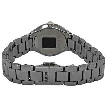 Grey plasma high-tech ceramic case and bracelet. Fixed grey plasma ceramic bezel with a rose gold PVD ring. Grey dial with rose gold-tone hands and diamond hour markers. Dial Type: Analog. Rado calibre 420 quartz movement. Scratch resistant sapphire crystal. Pull / push crown. Solid case back. Round case shape. Case size: 30 mm. Case thickness: 4.9 mm. Fold over clasp. Water resistant at 30 meters / 100 feet. Functions: hour, minute. Dress watch style. Watch label: Swiss Made. Rado True Diamond Grey Dial Grey Ceramic Ladies Watch R27956722