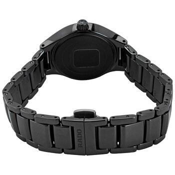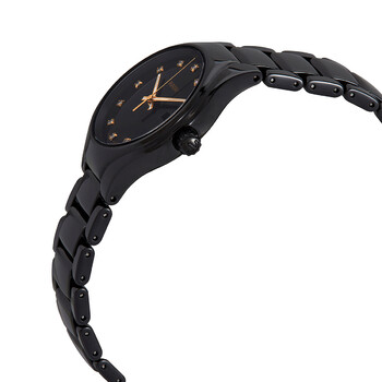 Black (high-tech) ceramic case and bracelet. Fixed black (high-tech) ceramic bezel. Black dial with luminous rose gold-tone hands and diamond hour markers. Dial Type: Analog. Luminescent hands. Date display at the 3 o'clock position. Quartz movement. Scratch resistant sapphire crystal. Pull / push crown. Solid case back. Round case shape. Case size: 30 mm. Case thickness: 8 mm. Folding clasp. Water resistant at 50 meters / 165 feet. Functions: date, hour, minute, second. Additional Info: 12 diamonds, 0.096 carat. True Diamonds Series. Dress watch style. Watch label: Swiss Made. Rado True Diamonds Quartz Black Dial Ladies Watch R27059732.