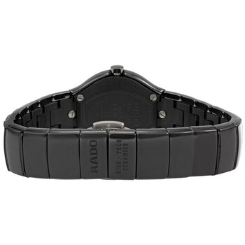Black ceramic case with a black ceramic bracelet. Fixed black ceramic bezel. Black dial with silver-tone hands and diamonds mark the quarter hour positions. The Rado name appears below the 12 o'clock position. Battery operated quartz movement. Scratch resistant sapphire crystal. Solid case back. Case diameter: 27 mm. Deployment clasp. Water resistant at 30 meters / 100 feet. Functions: hour, minute, second. Rado True Jubile Black Dial Ceramic Ladies Watch R27655712.