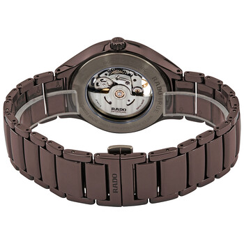 Brown high-tech ceramic case and bracelet. Fixed brown high-tech ceramic bezel. Skeleton dial with luminous rose gold-tone hands and index hour markers. Minute markers around the outer rim. Dial Type: Analog. Luminescent hands and markers. Automatic movement. Scratch resistant sapphire crystal. Pull / push crown. Transparent case back. Round case shape. Case size: 40 mm. Case thickness: 10.4 mm. Band width: 20 mm. Fold over clasp with a safety release. Water resistant at 50 meters / 165 feet. Functions: hour, minute, second. Casual watch style. Watch label: Swiss Made. Rado True Open Heart Automatic Men's Watch R27511302.