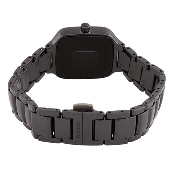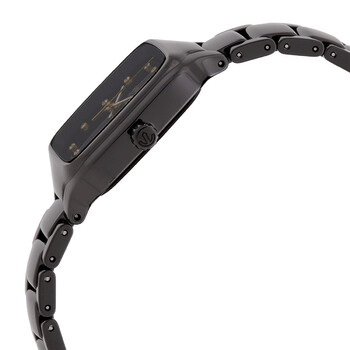 Black ceramic case and bracelet. Fixed black ceramic bezel. Black dial with gold-tone hands and diamond hour markers. Dial Type: Analog. Date display at the 3 o'clock position. Quartz movement. Scratch resistant sapphire crystal. Solid case back. Square case shape, case size: 29 mm. Fold over clasp. Water resistant at 50 meters / 165 feet. Functions: date, hour, minute, second. Additional Info: original box, international warranty card, manual (complete accessories). True Series. Luxury watch style. Watch label: Swiss Made. Rado True Quartz Diamond Black Dial Ladies Watch R27080702.
