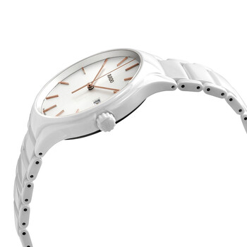 White (high-tech) ceramos case with a white (high-tech) ceramos bracelet. Fixed white (high-tech) ceramos bezel. White dial with rose gold-tone hands and index hour markers. Dial Type: Analog. Date display at the 3 o'clock position. Rado calibre 115 quartz movement. Scratch resistant sapphire crystal. Pull / push crown. Solid case back. Round case shape. Case size: 40 mm. Case thickness: 8.9 mm. Band width: 18 mm. Butterfly clasp. Water resistant at 50 meters / 165 feet. Functions: date, hour, minute, second. Additional Info: ceramos is a hi-tech ceramic and metal composite. True Series. Casual watch style. Watch label: Swiss Made. Rado True Quartz White Dial White Ceramos Men's Watch R27240102.
