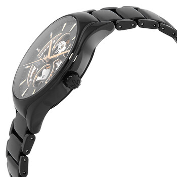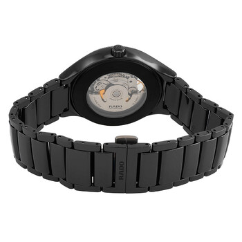 Black high-tech ceramic case and bracelet. Fixed black high-tech ceramic bezel. Black dial with rose gold-tone hands and index hour markers. Dial Type: Analog. Rado Calibre 734 automatic movement with an 80-hour power reserve. Scratch resistant sapphire crystal. Pull / push crown. Transparent case back. Round case shape, case size: 40 mm, case thickness: 10.4 mm. Deployment with push button release clasp. Water resistant at 50 meters / 165 feet. Functions: hour, minute, second. True Round Series. Dress watch style. Watch label: Swiss Made. Rado True Round Automatic Black Dial Unisex Watch R27107172.
