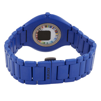 Blue high-tech ceramic case and bracelet. Fixed blue high-tech ceramic bezel. Blue dial with blue hands and index hour markers. Dial Type: Analog. Quartz movement. Scratch resistant sapphire crystal. Pull / push crown. Solid case back. Round case shape, case size: 39 mm, case thickness: 5 mm. Deployment with push button release clasp. Water resistant at 30 meters / 100 feet. Functions: hour, minute. True Round Thinline Les Couleurs™ Le Corbusier Spectacular Ultramarine 4320k Series. Watch label: Swiss Made. Item Variations: 01.420.6092.3.062. Rado True Round Thinline Les Couleurs Le Corbusier Spectacular ultramarine 4320K Quartz Blue Dial Watch R27092622.