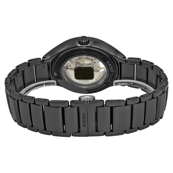 Black (high-tech) ceramic case and bracelet. Fixed black (high-tech) ceramic bezel. Skeleton dial with silver-tone hands and index hour markers. Minute markers around the outer rim. Dial Type: Analog. Luminescent hands and markers. Automatic movement. Scratch resistant sapphire crystal. Pull / push crown. Transparent case back. Round case shape. Case size: 40 mm. Case thickness: 10.4 mm. Bracelet width: 20 mm. Butterfly clasp. Water resistant at 50 meters / 165 feet. Functions: hour, minute, second. Luxury watch style. Watch label: Swiss Made. Rado True Skeleton Dail Automatic Men's Watch R27100112.
