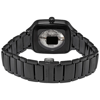 Black ceramic case with a black ceramic bracelet. Fixed black ceramic bezel. Black (open heart) dial with luminous rose gold-tone hands and index hour markers. Minute markers around the outer rim. Dial Type: Analog. Luminescent hands. Automatic movement with an 80-hour power reserve. Scratch resistant sapphire crystal. Transparent case back. Square case shape. Case size: 38 mm. Case thickness: 9.7 mm. Fold over clasp with a push button release. Water resistant at 50 meters / 165 feet. Functions: hour, minute, second. True Square Series. Casual watch style. Watch label: Swiss Made. Rado True Square Automatic Black Dial Men's Watch R27086162.