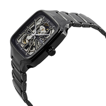 Black ceramic case and bracelet. Fixed black ceramic bezel. Black (open heart) dial with luminous silver-tone hands and index hour markers. Minute markers around the outer rim. Dial Type: Analog. Luminescent hands. Automatic movement with an 80-hour power reserve. Scratch resistant sapphire crystal. Transparent case back. Square case shape, case size: 38 mm, case thickness: 9.7 mm. Fold over clasp with a safety release. Water resistant at 50 meters / 165 feet. Functions: hour, minute, second. Watch label: Swiss Made. Rado True Square Automatic Open Heart Unisex Watch R27086152.