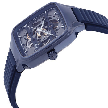 Navy blue ceramic case with a navy blue rubber strap. Fixed navy blue ceramic bezel. Skeleton dial with silver-tone hands and index hour markers. Dial Type: Analog. Rado Calibre 808 automatic movement with an 80-hour power reserve. Scratch resistant sapphire crystal. Pull / push crown. Transparent case back. Square case shape, case size: 38 mm, case thickness: 9.7 mm. Deployment clasp. Water resistant at 50 meters / 165 feet. Functions: hour, minute, second. True Square Series. Dress watch style. Watch label: Swiss Made. Rado True Square Automatic Skeleton Dial Unisex Watch R27178205.